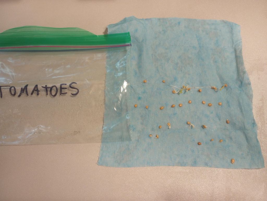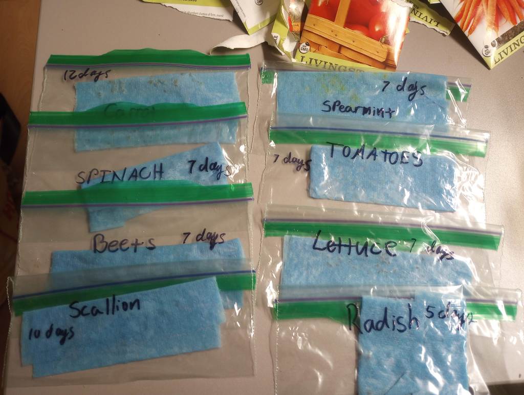 I started by getting all my supplies together. I cut some paper towels into quarters. One at a time, I sprayed s little water on the paper towel. I counted out 10 seeds of each variety (so a total of 30 beet seeds, for example), folded up the paper towels and sealed them into “snack-size” zippy bags.