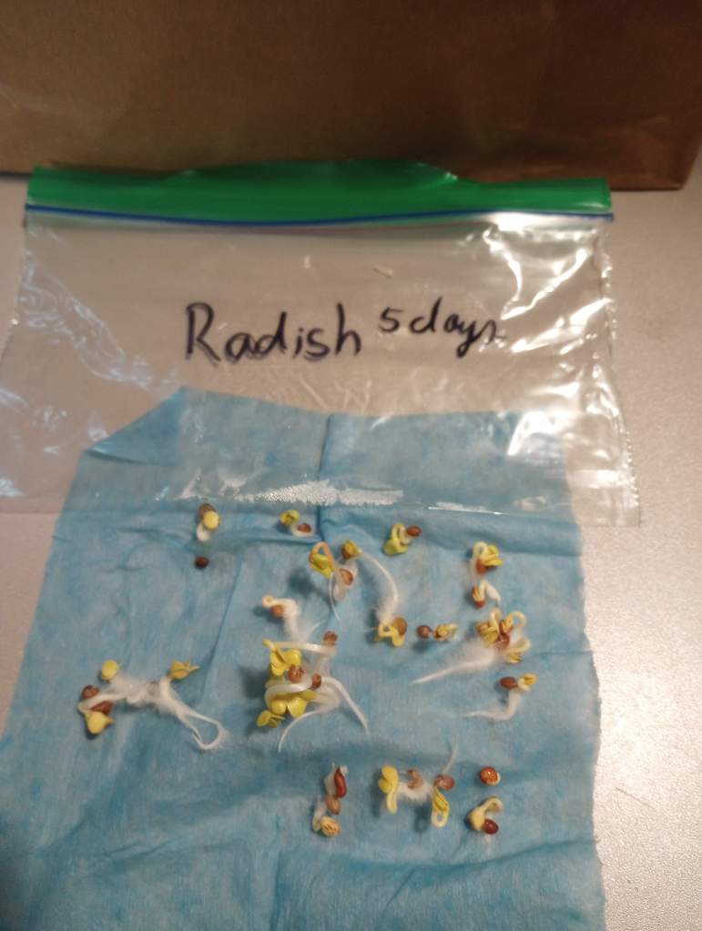 Then came the hardest part- waiting. Radishes sprout after five days, the packets told me. On day five I opened the radish bag to find…