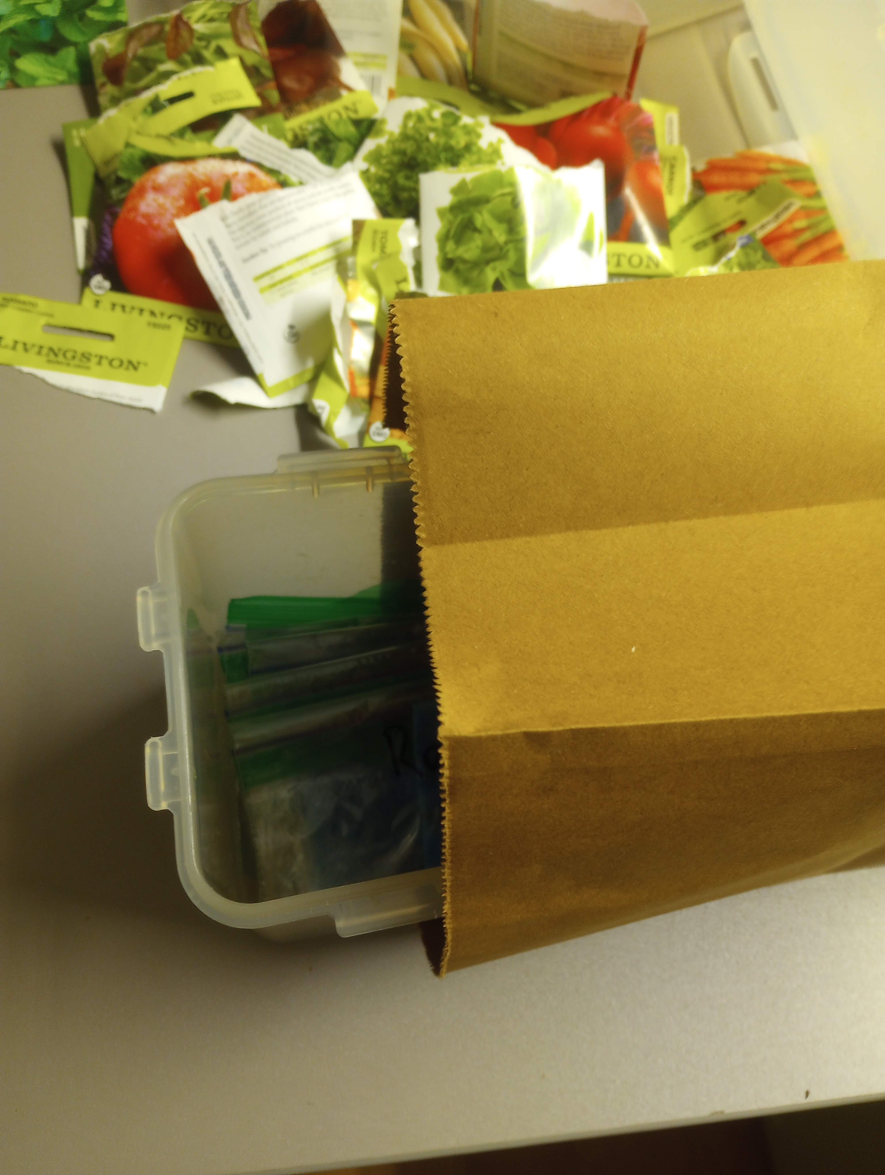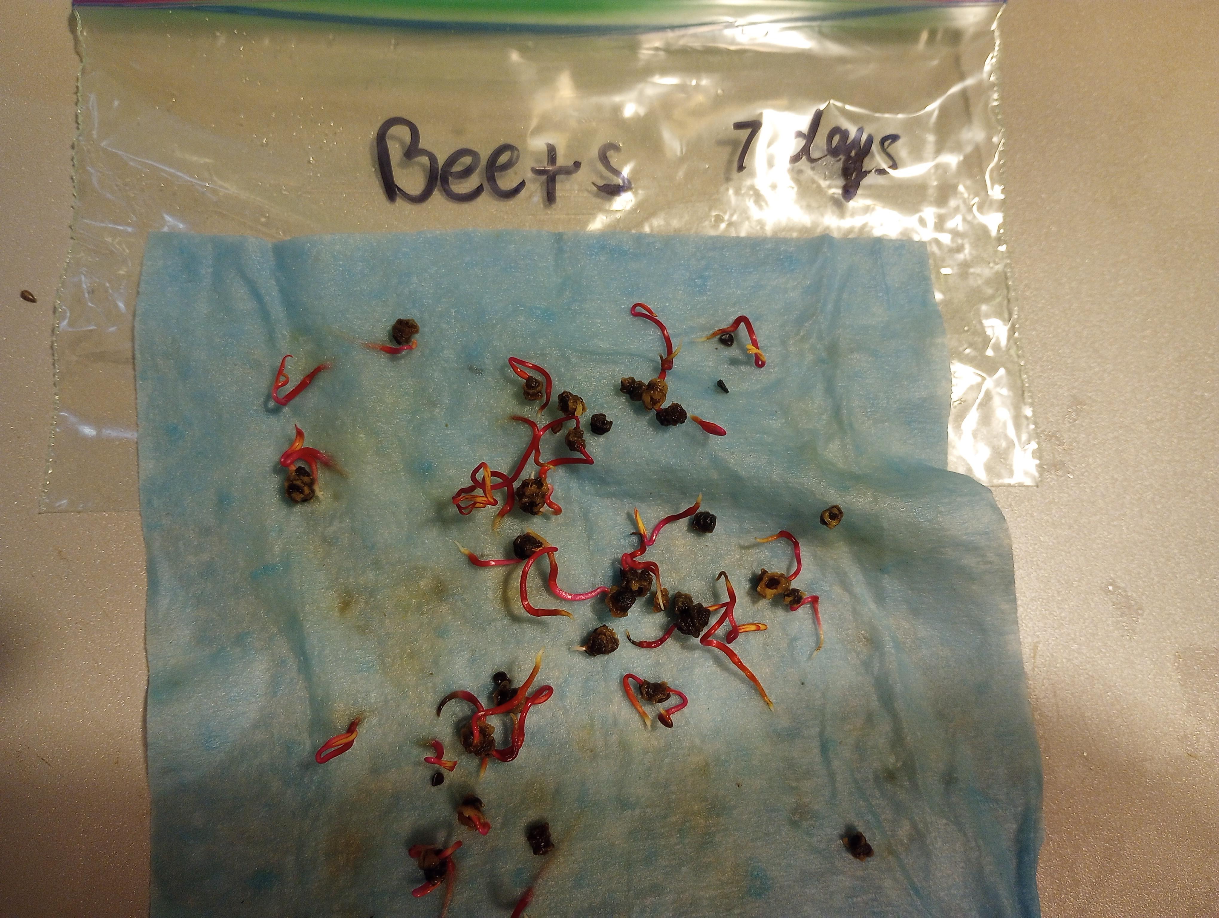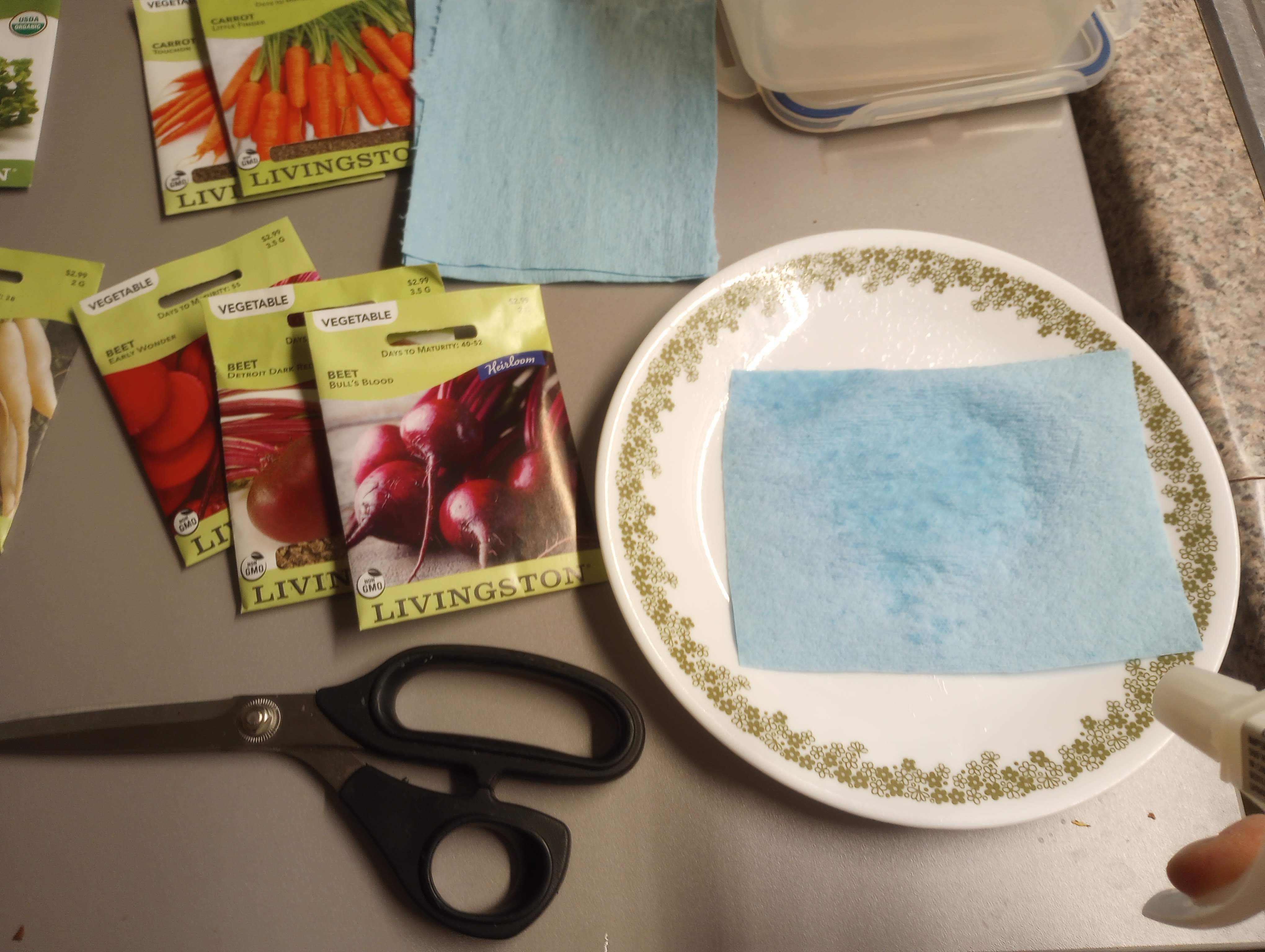 I started by getting all my supplies together. I cut some paper towels into quarters. One at a time, I sprayed s little water on the paper towel. I counted out 10 seeds of each variety (so a total of 30 beet seeds, for example), folded up the paper towels and sealed them into “snack-size” zippy bags.