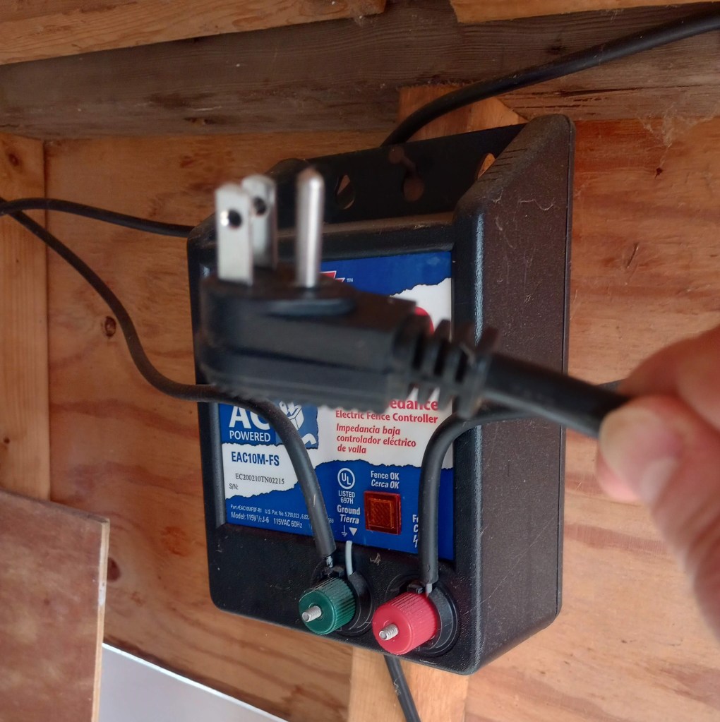 The next step, which required two hands so I did not get pictures, was to test conductive lines with an electrical multimeter. We happen to have one in the house already. If you get an electric fence for your garden or your animals you should invest in one. I was able to verify that electricity was flowing through the lines I repaired and through the whole fence. We found and repaired all the breaks! Finally, I plugged the energizer back in and turned the fence on. Our garden and chicken run are now protected.