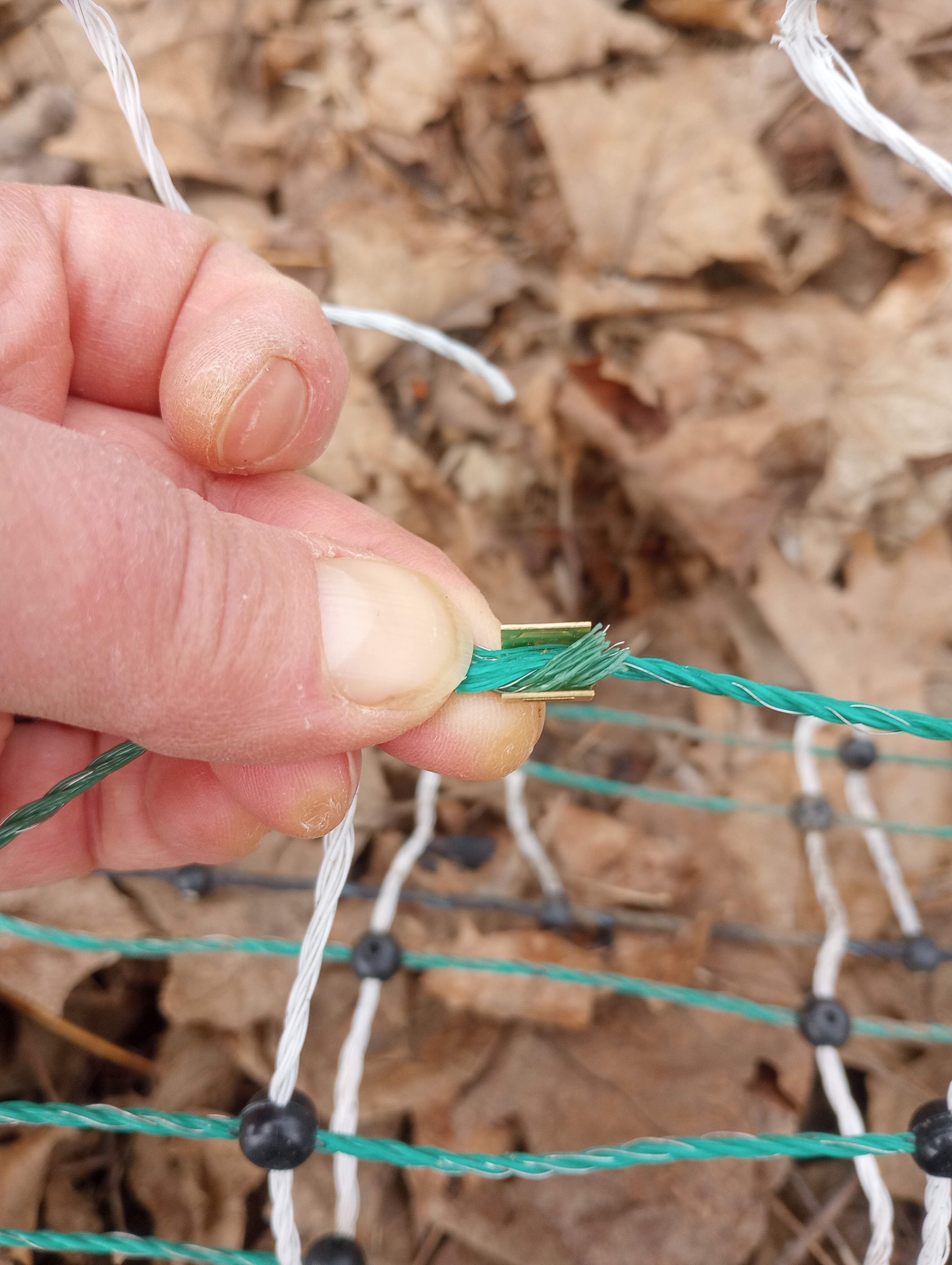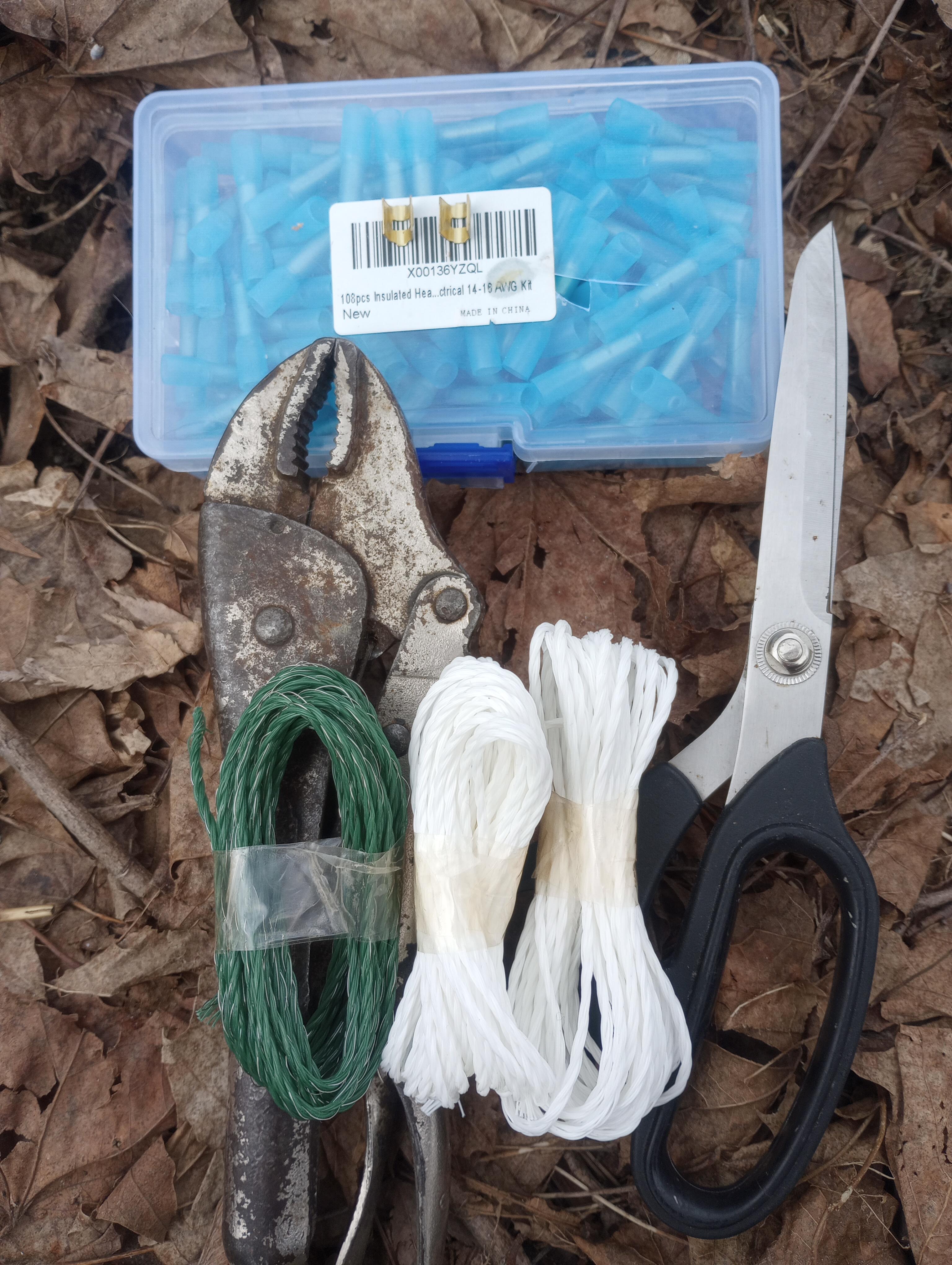After watching some internet videos of experienced electric fence fixers, I gathered all my supplies. The fence came with a repair kit, which I was able to locate. I also used a pair of scissors for snipping the lines and a vice-grip plier for crimping my connections. Electric fences have two kinds of line in them. On our fence the horizontal conductive lines, through which the electricity flows, are green. The vertical insulating lines, which prevent the conductive lines from contacting each other and shorting out, are white.