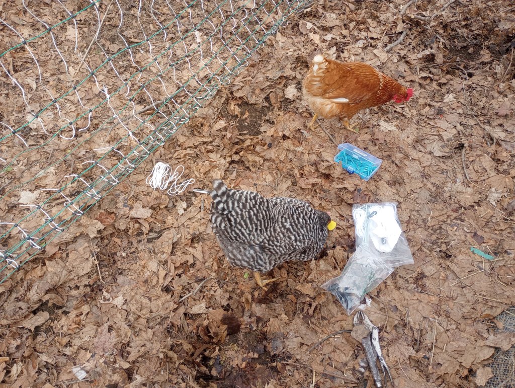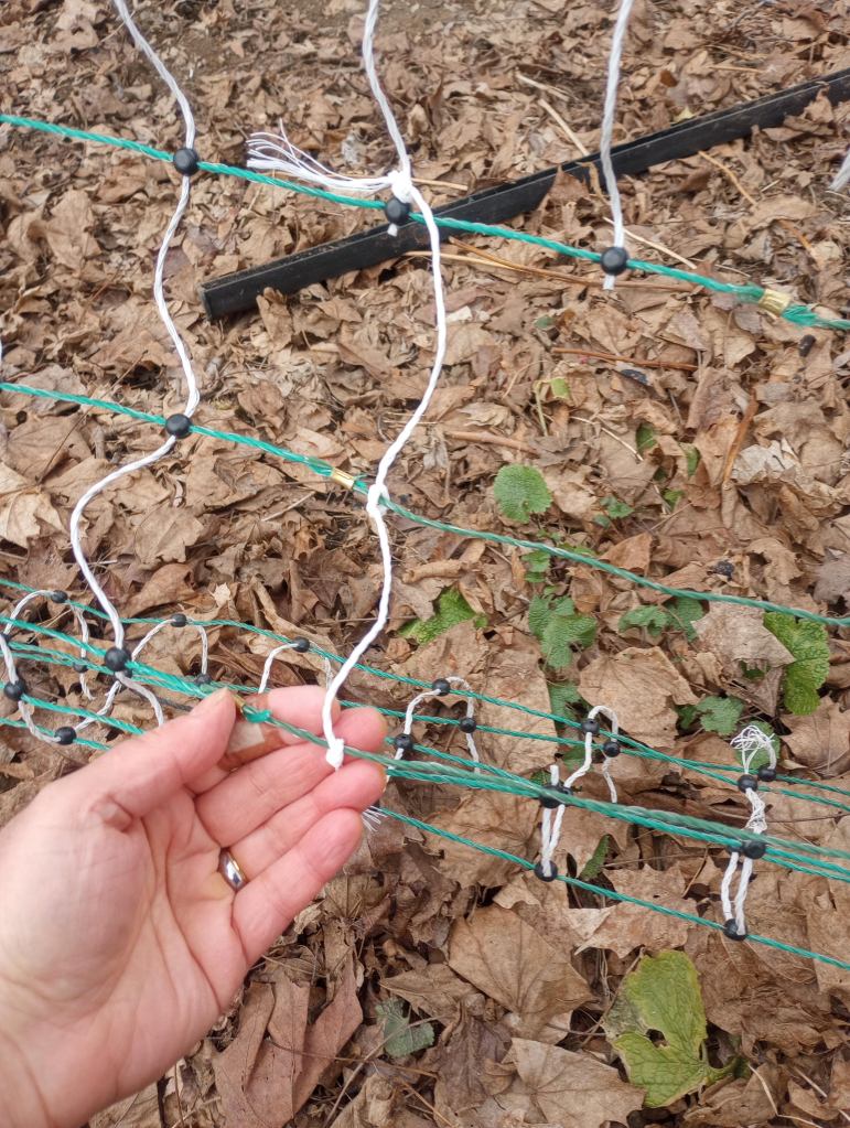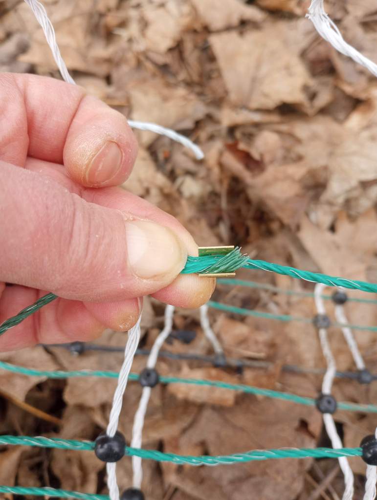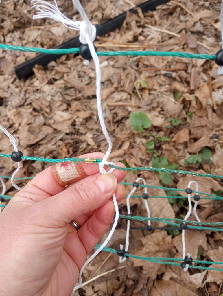 Mr. Food It Yourself gifted me an electrified poultry netting fence about 7 years ago after a gardening season plagued by squirrels and woodchucks. The fencing is designed to be installed and maintained by average humans, no electrician certifications required. This did not make us feel any less apprehensive as we drove grounding rods into the dirt, connected heavy wires, and hooked up the energizer unit. I distinctly remember us staring at the energizer and saying to each other “Okay, turn it on.” “No, YOU turn it on”. We have become much more comfortable with the zapping fence since then, but we have not had to make any repairs until now. This winter left two areas of the fence with significant damage. I had to get past my fears and get to fixing it in order to protect my chickens and my tomatoes.